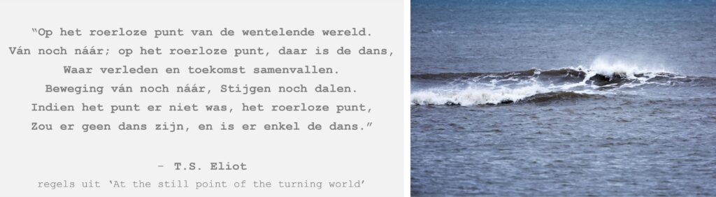 Toch blijkt het niet eenvoudig in ons drukke dagelijkse leven om je zwaartepunt te verplaatsen naar het perspectief van de zee. Twee weken geleden zat ik in een driedaagse stilte-retraite met een mooie volle groep in duinboerderij ZeeVELD. Je kon zo door de duinen lopen naar de zee. Deze nabijheid was ondersteunend, maar het was voor mij vooral weer het ruimte geven aan de stilte, het niet op weg gaan, en het toestaan om los te laten, dat zorgden voor de verschuiving van het perspectief. Dus kostbare tijd om tijdloos te zijn, alles te laten en te rusten in de diepte van de zee, in de roerloze grond van Zijn.